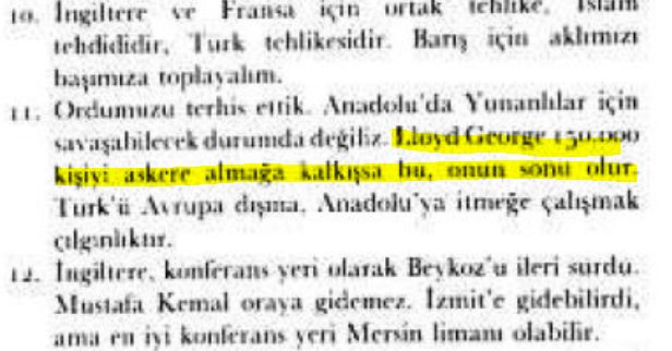 🔟...Lloyd George Yunanlıların yeni bir saldırı yapması için 150000 kişiyi askere almağa kalkışarsa ya da parlamentodan 100 milyon sterlin isterse bu hükümetinin ve onun sonu olur. Türk’ü Avrupa dışına, Anadolu’ya çekilmeğe zorlamak akıl işi değildir.