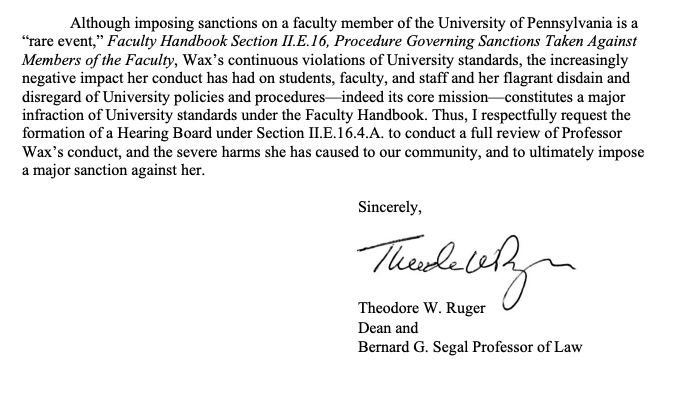 The walls are closing in on Amy Wax. Late last month, the dean of UPenn's law school formally requested that the Faculty Senate initiate disciplinary hearings against Wax over her incredibly racist conduct.