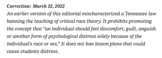 Does this distinction sound vaguely familiar to you? If so, it may be because of an op-ed that @kmele, @jasonintrator, @DavidAFrench and @thomaschattwill wrote a ways back against these anti-CRT laws. They misdescribed a law and had to issue a correction.