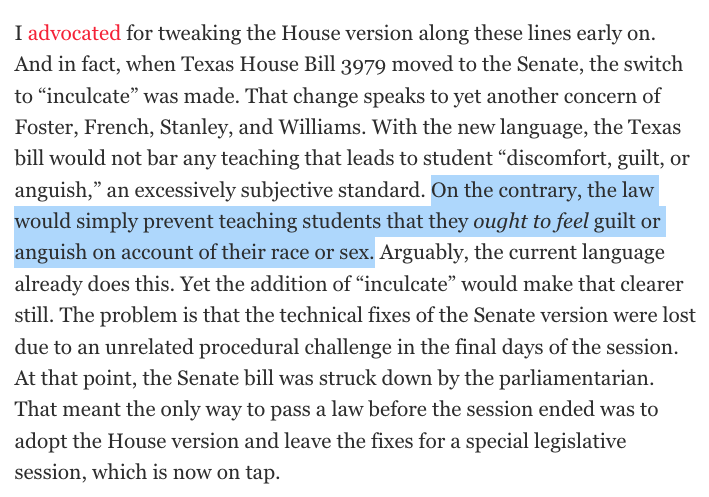 @kmele@jasonintrator@DavidAFrench@thomaschattwill This error prompted no end of contemptuous tut-tutting by the law's defenders. "Sure, if one of these laws actually stopped schools from teaching anything that makes students feel discomfort, that would be bad," they declared. "But that's *obviously* not what they do."