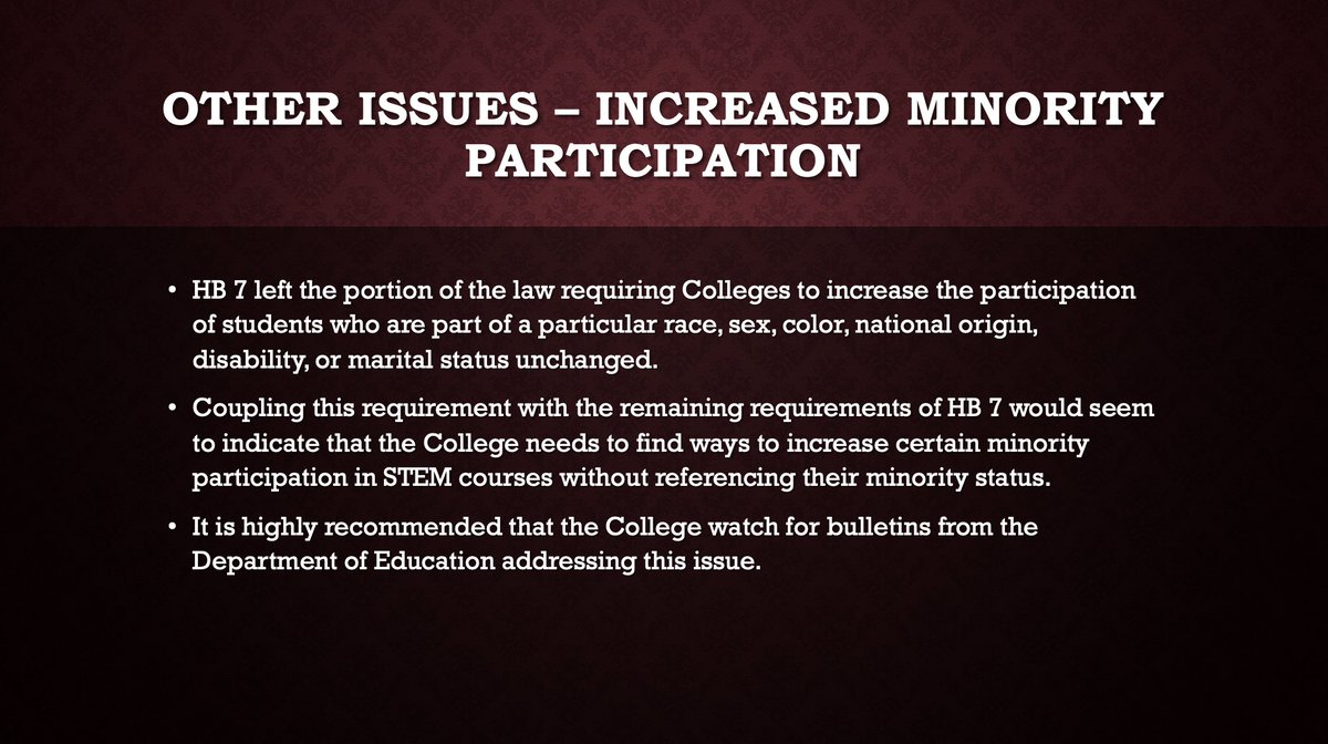 "Coupling this requirement with the remaining requirements of HB 7 would seem to indicate that the College needs to find ways to increase certain minority participation in STEM courses without referencing their minority status."