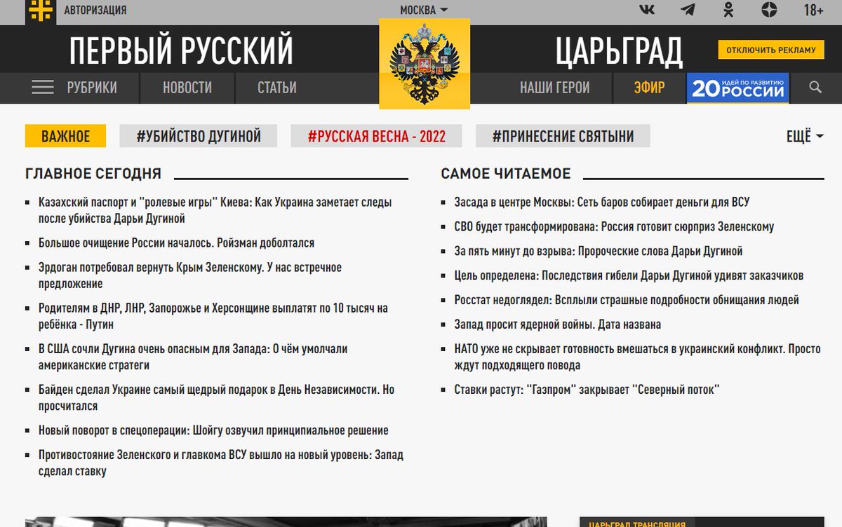 Entre 2017 y 2018, Dugin fue el editor en jefe de Tsargrad TV. En 2020 las redes sociales occidentales eliminaron las cuenta de Dugin citando las sanciones de Estados Unidos como el motivo para eliminar las cuentas