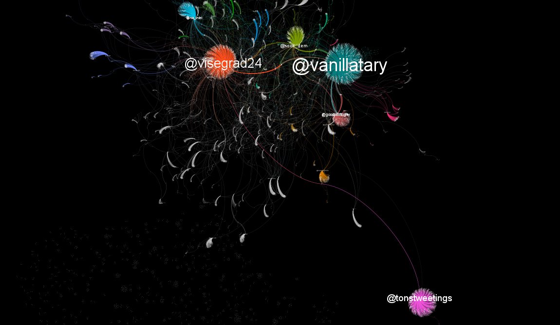 La difusión del tuit sería esta, y como se ve destacan algunas cuentas (incluída la que lanzó el tuit) por haber recibido más rts y por tanto difundirse más