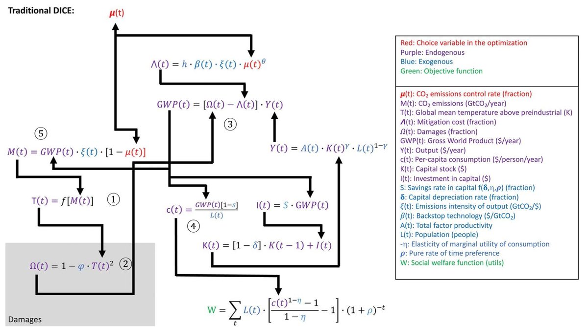 (* the simplified - and very useful! - top-level schematic of the vanilla DICE-2016R model happens to be courtesy of *another* climate scientist, @PatrickTBrown31 (with @hsaunders6) who took the time to dive into the CBA-IAM's and experiment... 🤷)