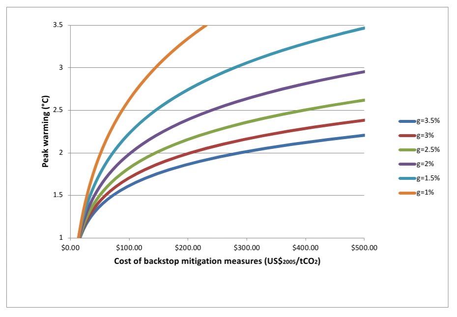 ... and ability to fund and adopt mitigation technologies at given prices up to (and including) intersection with the backstop technology price. Again, all else equal, at higher levels of growth and wealth, we will adopt the backstop technology sooner.