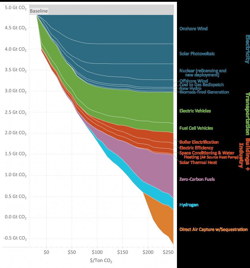 Technologies which, ideally, ① could be deployed at large scale, ② used for *multiple* difficult to abate sectors/applications, and ③ critically, whose *marginal cost per tonne would stop (or dramatically slow) rising* at some point.