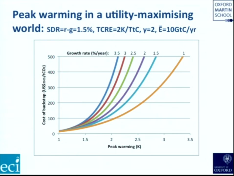 • *very* interesting results from this simple model/assumptions, regarding peak warming and two particular policy-relevant variables: the ultimate "backstop mitigation technology" price, and rate of economic growth. Results which may perplex/upset *some*?