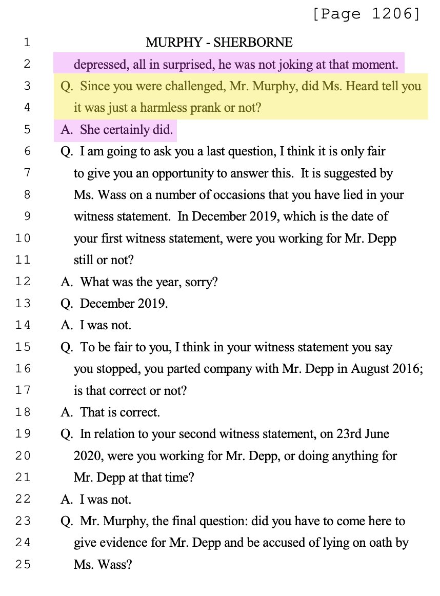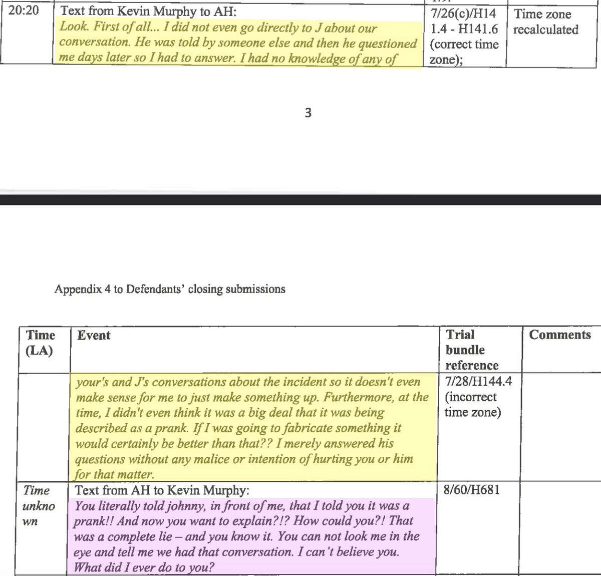 Kevin Murphy testified under oath in the UK, that Amber angrily told him in a phone call that the 💩 had been a "harmless prank”. He did not testify in the US trial.