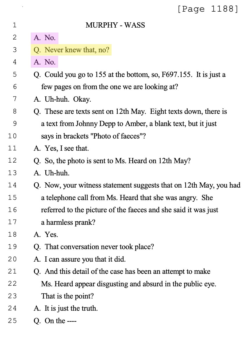 When asked if Depp had a “slight lavatorial sense of humor”, Murphy said that he “never knew that, no.”