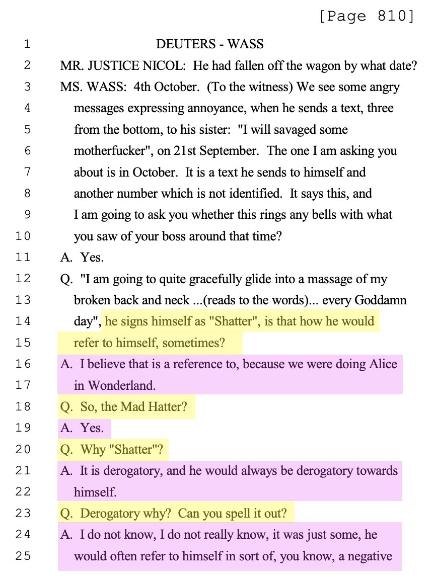 Depp also called himself the “Shatter”, a pun on him playing The Mad Hatter in “Alice In Wonderland”. He told his assistant Stephen Deuters that he would “poop on his chest”.