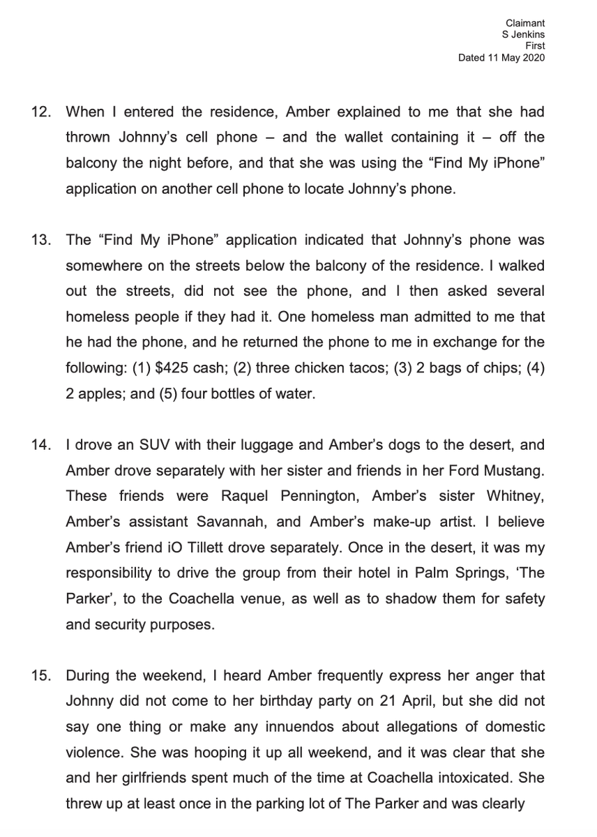 In the US trial, Starling Jenkins III, an executive limo driver and security personnel who has worked for Johnny since 1993, claimed that Amber told him on the way to Coachella with her friends that she had pooped the bed as a “practical joke gone wrong."