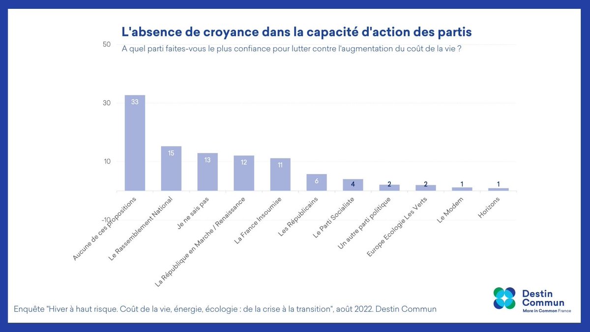 Si l’intervention de l’Etat est plébiscitée, la perte de foi dans le politique se confirme. 33% des Français ne font confiance à aucun parti pour lutter contre la hausse des prix. Le RN est le parti qui recueille le plus de confiance (15%).