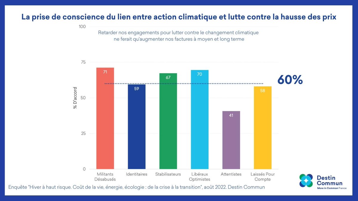 Les Français lient la nécessité d’accélérer la transition avec la question du coût de la vie : 60% considèrent que retarder nos engagements pour le climat ne ferait qu’augmenter nos factures à moyen et long terme.