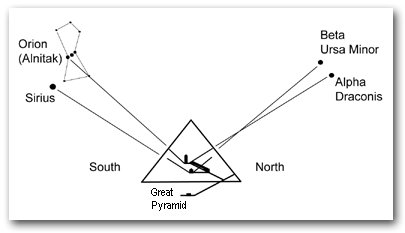 The air shafts in the chamber, thought to represent the fallopian tombs connected to the womb (sarcophagus), align with the constellations Orion's belt and the other Alpha Draconis.