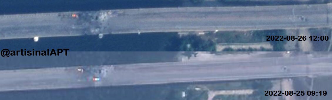 Satiate images of damade to the bridge by @ArtisanalAPT dated to 2022-08-26 12:00 UTC and 2022-08-25 09:19 UTC.