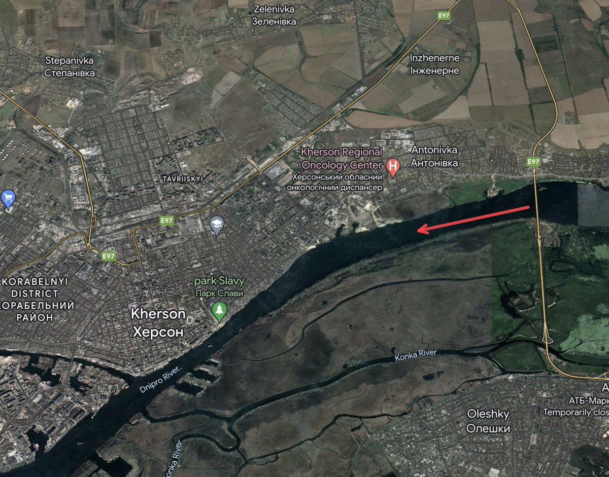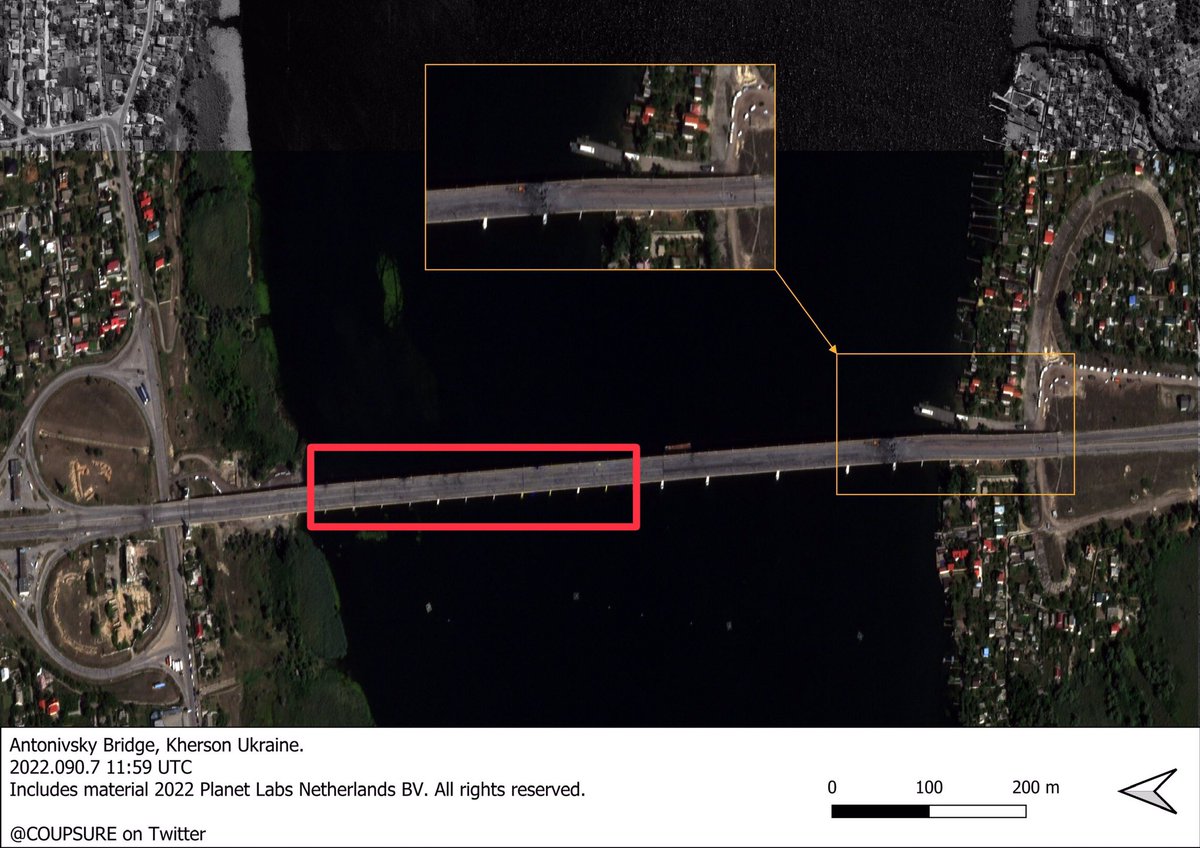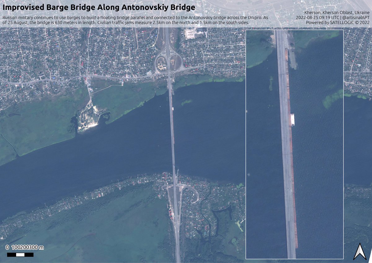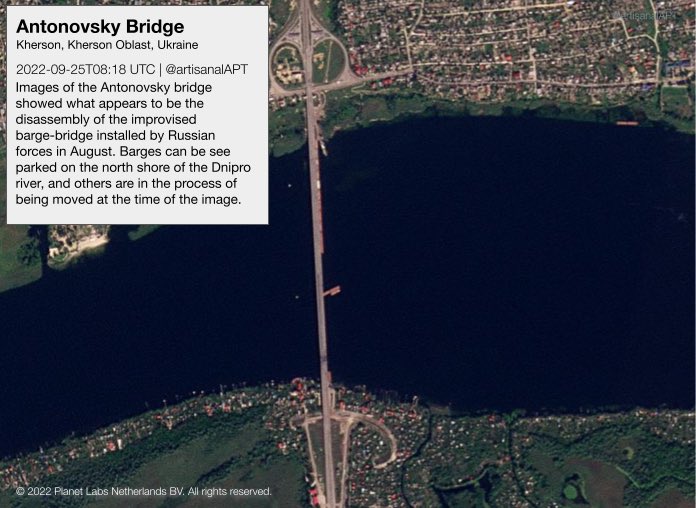 Locals report that the barge bridge was disassembled by Russians. One of theories is that it’s due to the fact that a bunch of other barges which Russians used as ferries were destroyed by Ukrainian strikes.