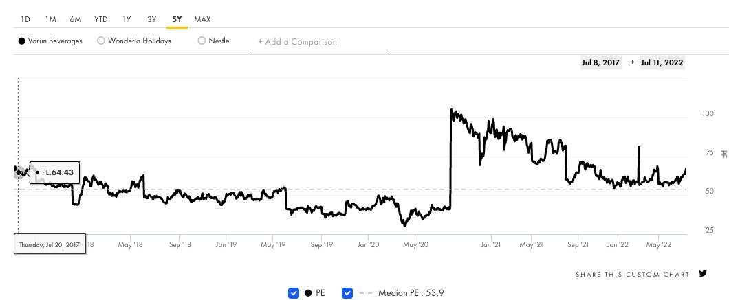 Another example that comes to mind is that of Varun Beverages Ltd. It has always traded at an average of 54x P/e multiple. As co built significant capacities and did a lot of backwards integration.