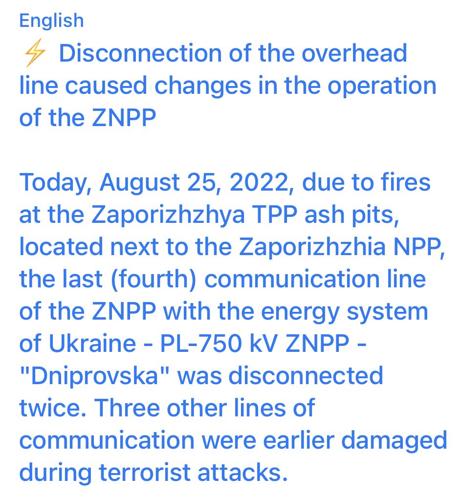 Should clarify based on the Ukrainian statement. The plant is still operational, they just lost the main transmission line to the Ukrainian grid. The NPP still has a local connection to the nearby thermal power plant.
