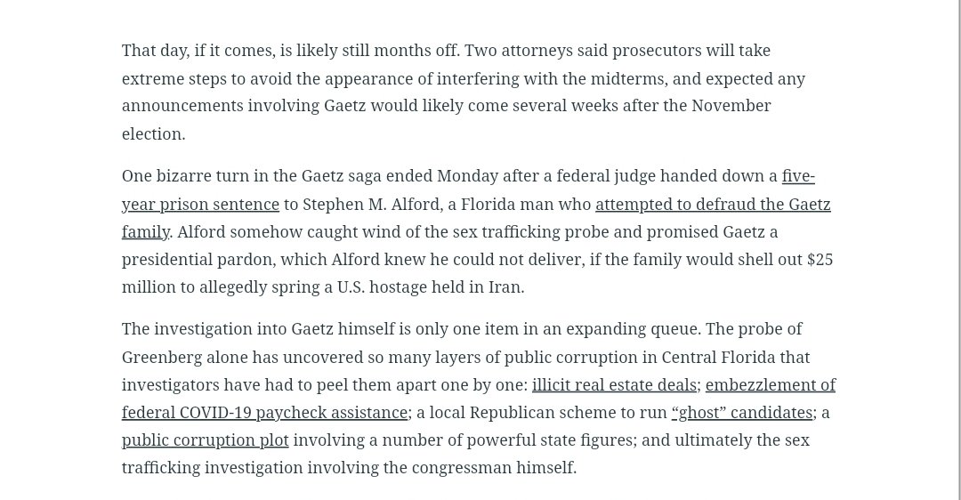 That day, if it comes, is likely still months off. Attorneys said prosecutors will take extreme steps to avoid the appearance of interfering w/the midterms & expected any announcements involving Gaetz would likely come several weeks after the Nov election.