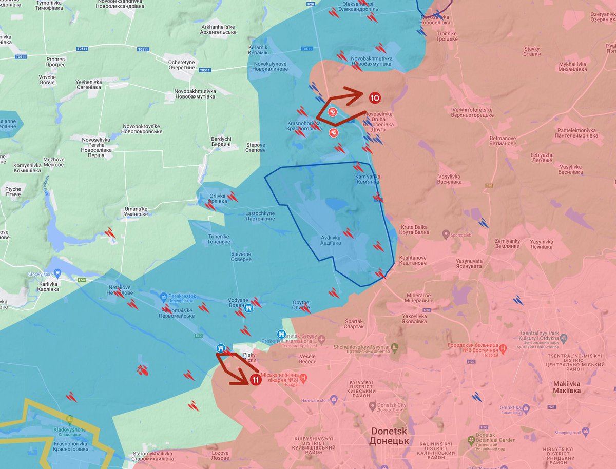 South of Avdiivka, Russia attacked Pervomaiske, but Ukraine repelled their attack (11). That artillery marker in Pervomaiske is a geo-confirmed artillery strike from today, showing my map is accurate in this area.