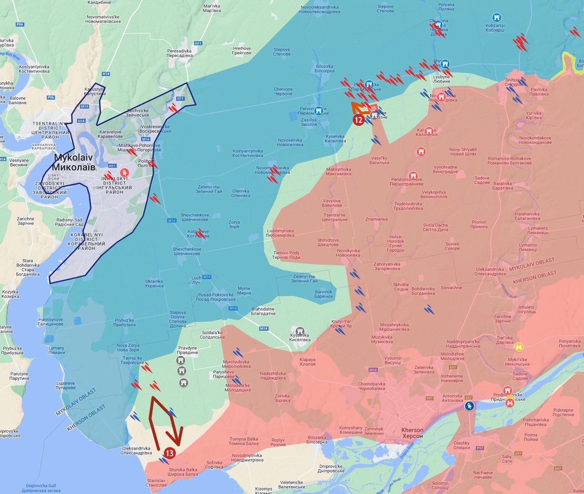 Russia attacked north from the Shyroka Balka area toward Tavrijske, but Ukrainian defenders managed to repel the attack (13).
