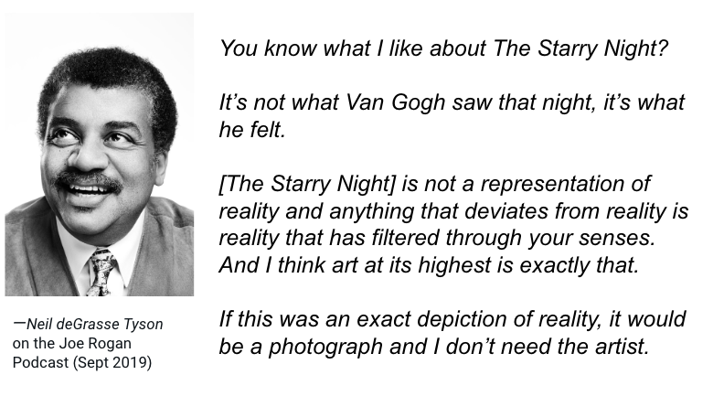 Here’s the clip of @neiltyson explaining why The Starry Night is his favorite painting: “It’s not what Van Gogh saw that night. It’s what he felt.”