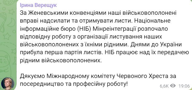 ⚡️The first letters from prisoners of war have arrived in Ukraine, – Deputy Prime Minister and Minister of Reintegration Iryna Vereshchuk says.