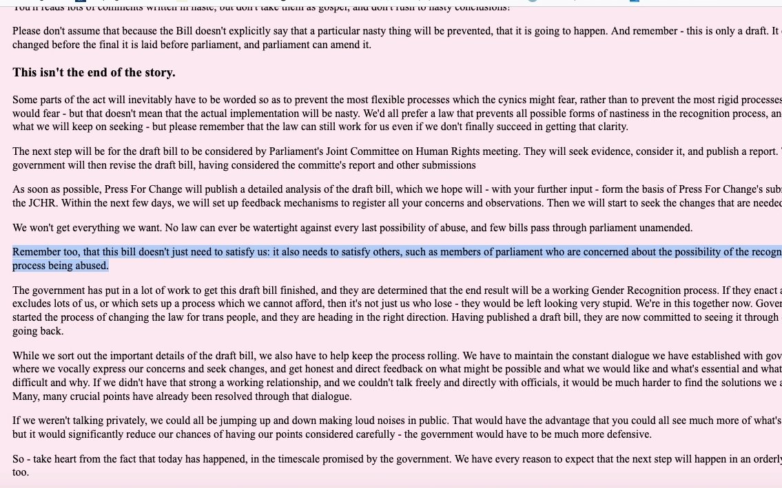 8./ Talking of jokes, Burns ridicules the idea anyone could abuse gender Self-ID. But here's Burns's colleague in 2003 from Burns's group, Press for Change, arguing how important it was to reassure MPs the recognition process could not be abused. Whoops.👇 gender.org.uk/gendys/2003/24…