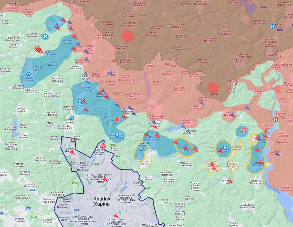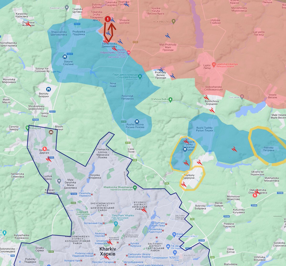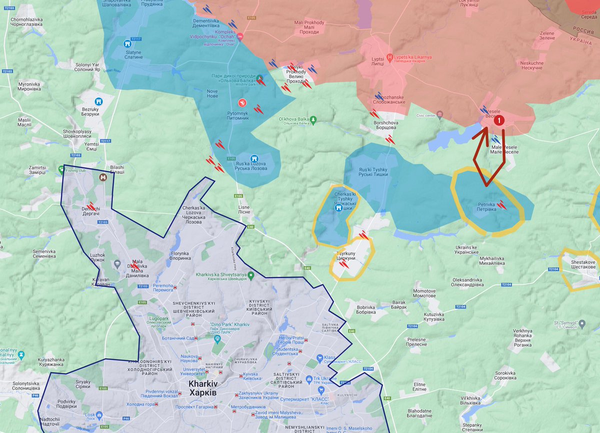 In the Kharkiv area, Russia attacked Petrivka today (1). Male Vesele is considered a gray area, and Ukraine has pushed troops through there in the recent past. The attack on Petrivka failed.