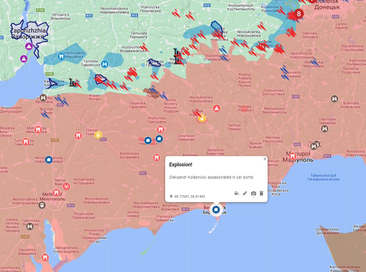 In Berdyansk, Oleksandr Kolesnikov, a Russian collaborator, was assassinated by a car bomb. Russians were quick to call this a terrorist attack but had no comment about what happened to Ihor Poznyanskyi.
