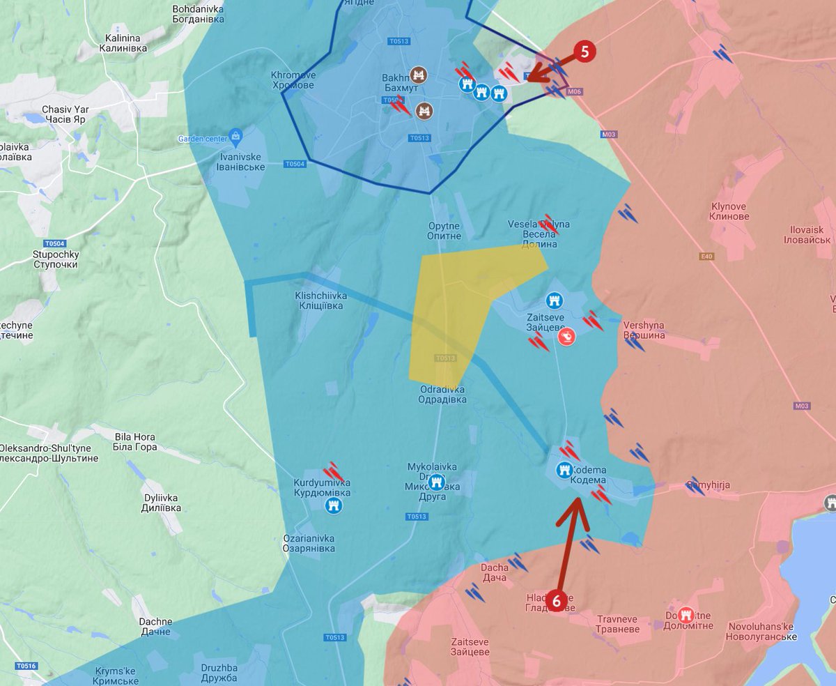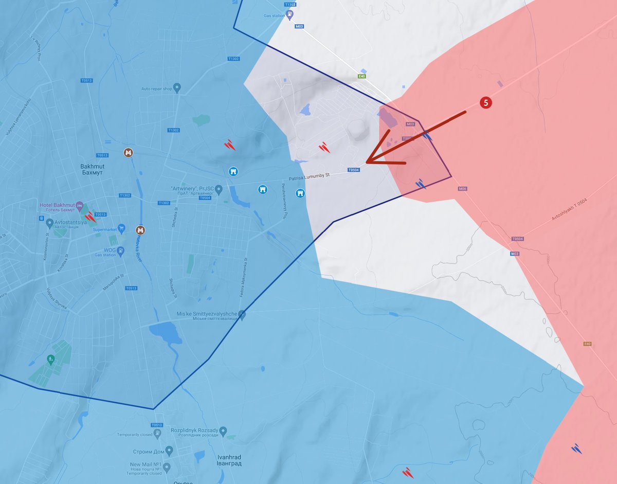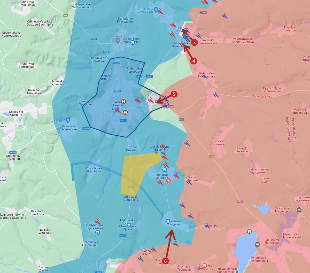 Russia is attacking Bakhmut (5). I marked the three primary Ukrainian fortified positions with the blue gatehouse icons.