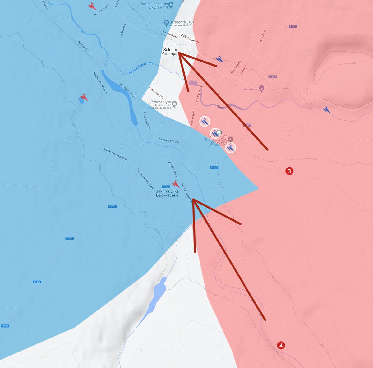 The fighting in Soledar was primarily in the east (3). Ukraine is heavily shelling the Knauf Gips plant. The concentration of fire suggests Russia has not moved much in the past 17 days. Maybe one or two blocks at most.