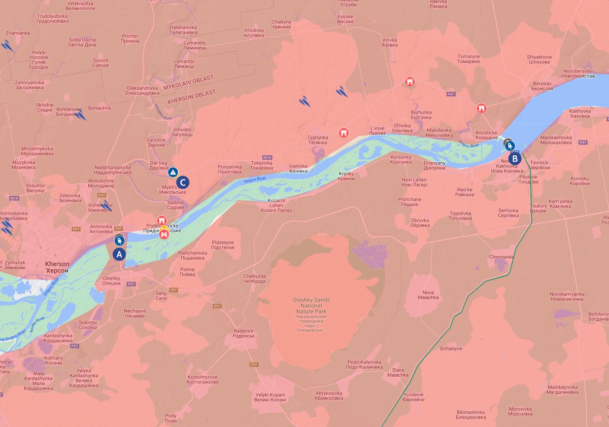 Today, Ukraine hit the Antonovskyi Bridge (A) and the Kakhovka bridge (B) with HIMARS. Many Russians died on the Kahovka bridge in this attack. Both bridges are now impassable, although Russia will continue attempts to repair them.