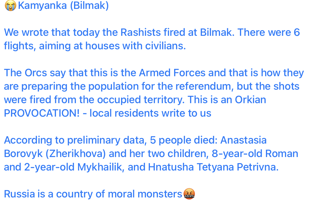 Speaking of terrorism, Russian artillery shelled Kamyanka, a town under their occupation in Zaporizhzhia, from Vershyna, around 20km to the east. The shelling destroyed several buildings.