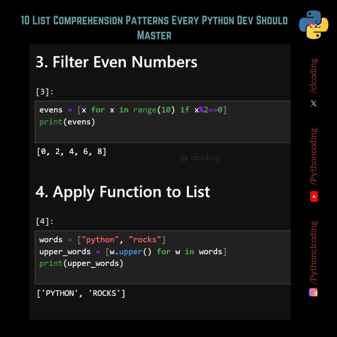 Replace simple for loops that build lists with a single readable expression: [x**2 for x in range(5)]. They’re concise and expressive for transformation/filtering tasks.