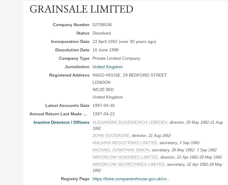 Lebedev set up Grainsale Limited in London in 1992 while still a serving member of the SVR (successor organisation to the Foreign arm of the KGB), which would grow into an offshore empire of shell companies, co directored with KGB colleague Kostin, who became Putin's VTB Banker