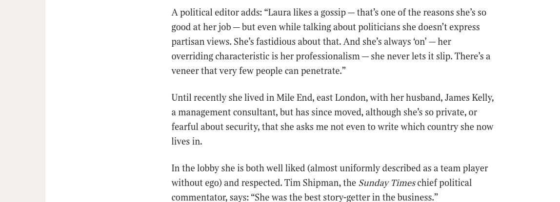 Has @bbclaurak now left the UK, & what is the hush hush Management Consultancy job her partner James Kelly does? Is there a conflict of interest if he works for Government, Saudi, Russian, China or Dubai clients?