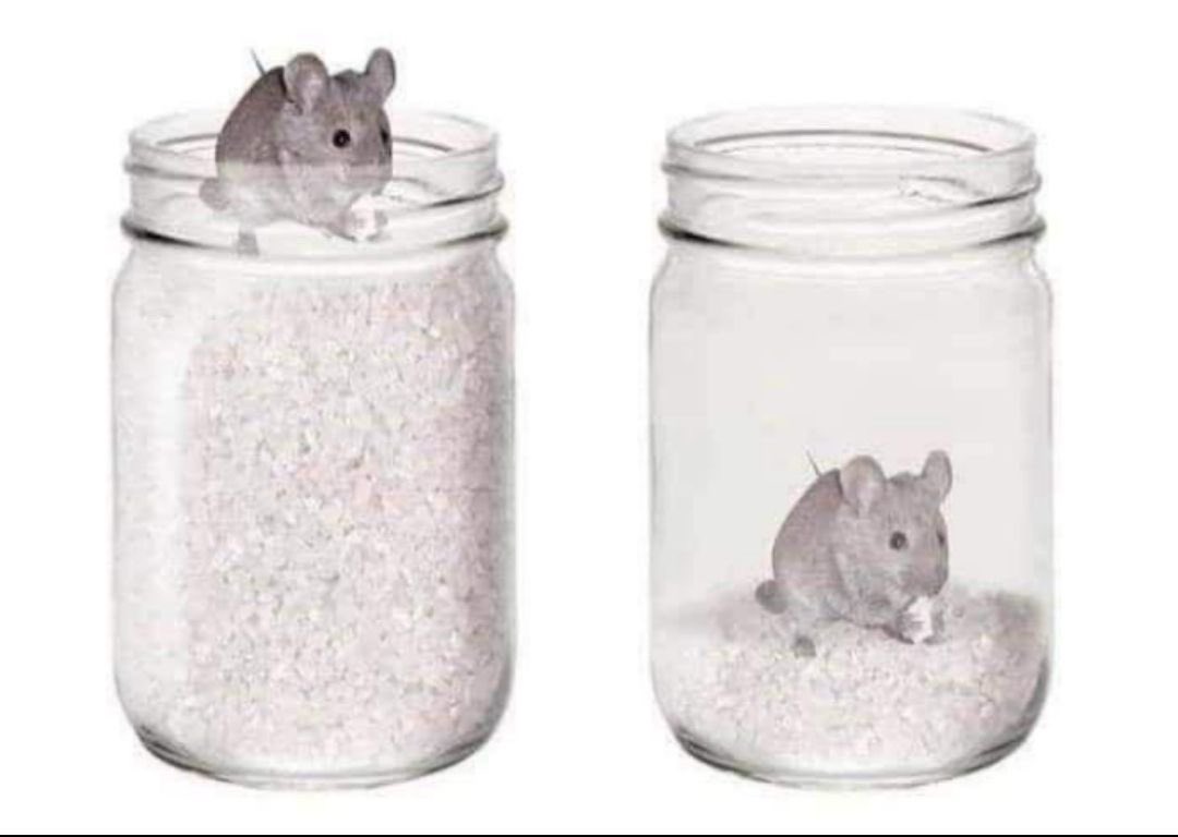 An oldie but goldie. A mouse was put at the top of a jar filled with grains. He was too happy to find so much of food around him. Now he doesn't need to run around searching for food and can happily lead his life.