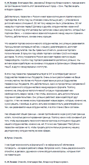 The main message of Tokayev was that "there is no ground for making pessimistic forecasts regarding the future" of RUS-KZ relations.