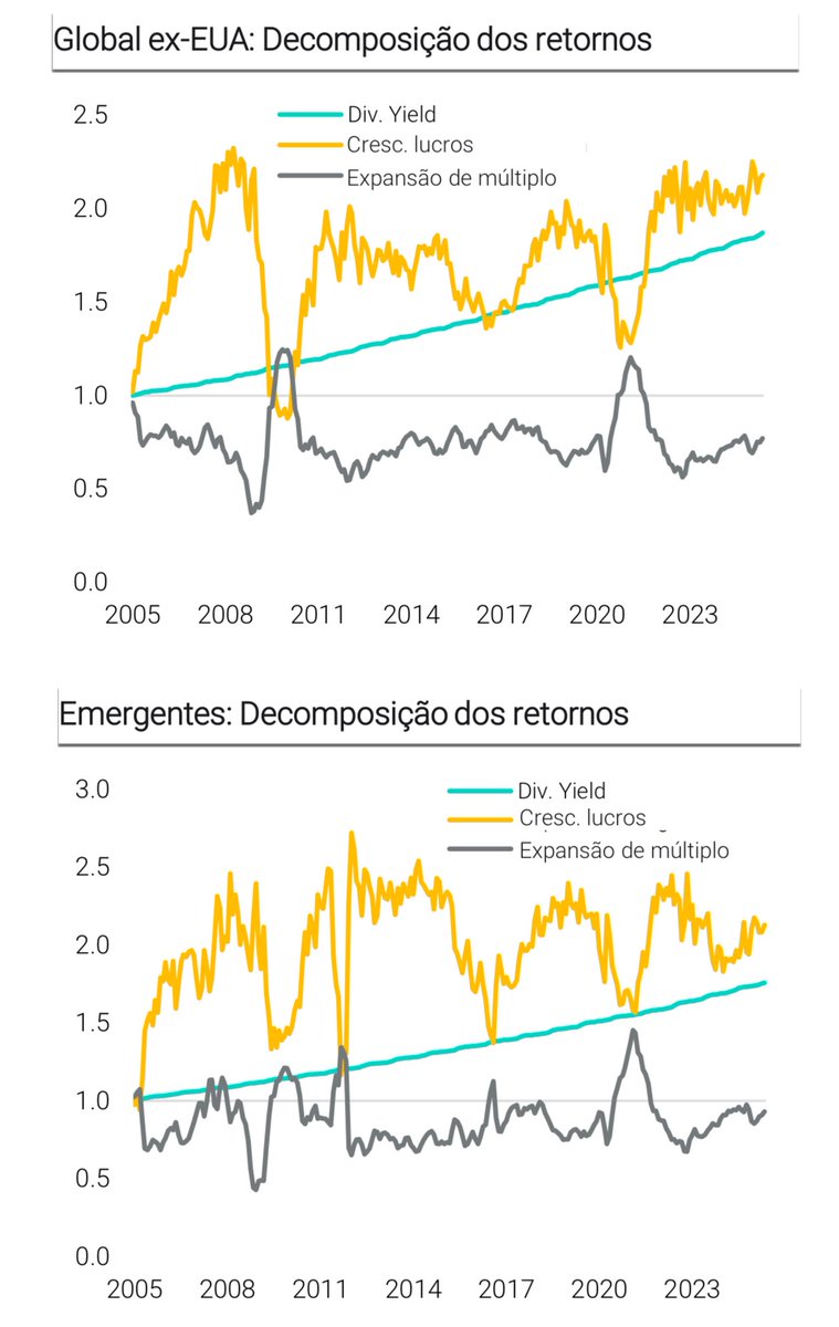 No caso dos índices globais, o crescimento de lucros também é um fator importante por trás dos retornos, mas o crescimento não vem sendo tão robusto quanto nos EUA (Big Techs estão aonde?).