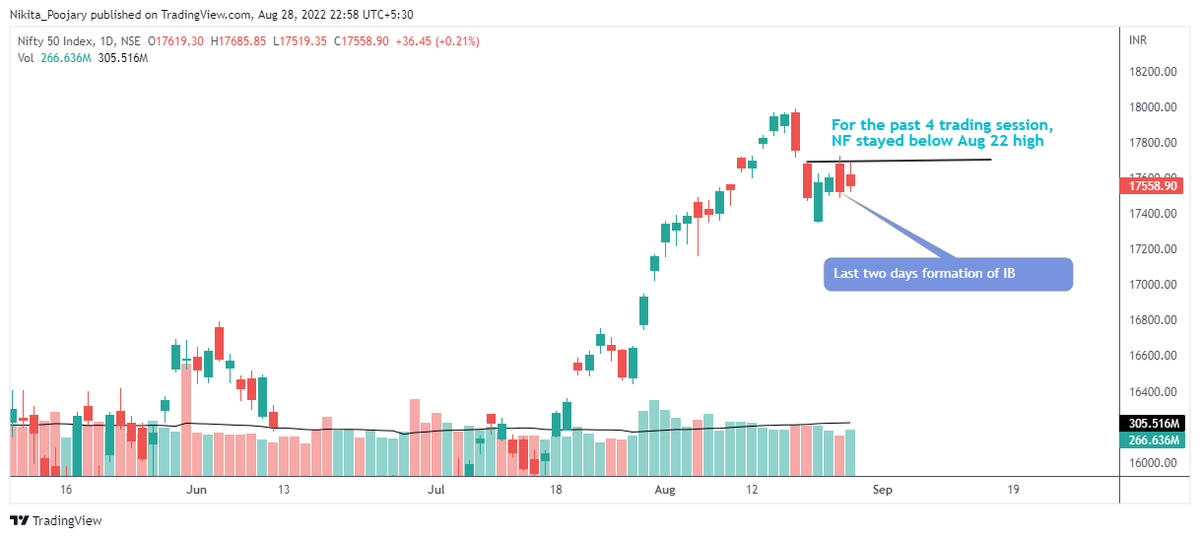 • In the past 4 trading session, unable to cross high of Aug 22 candle.