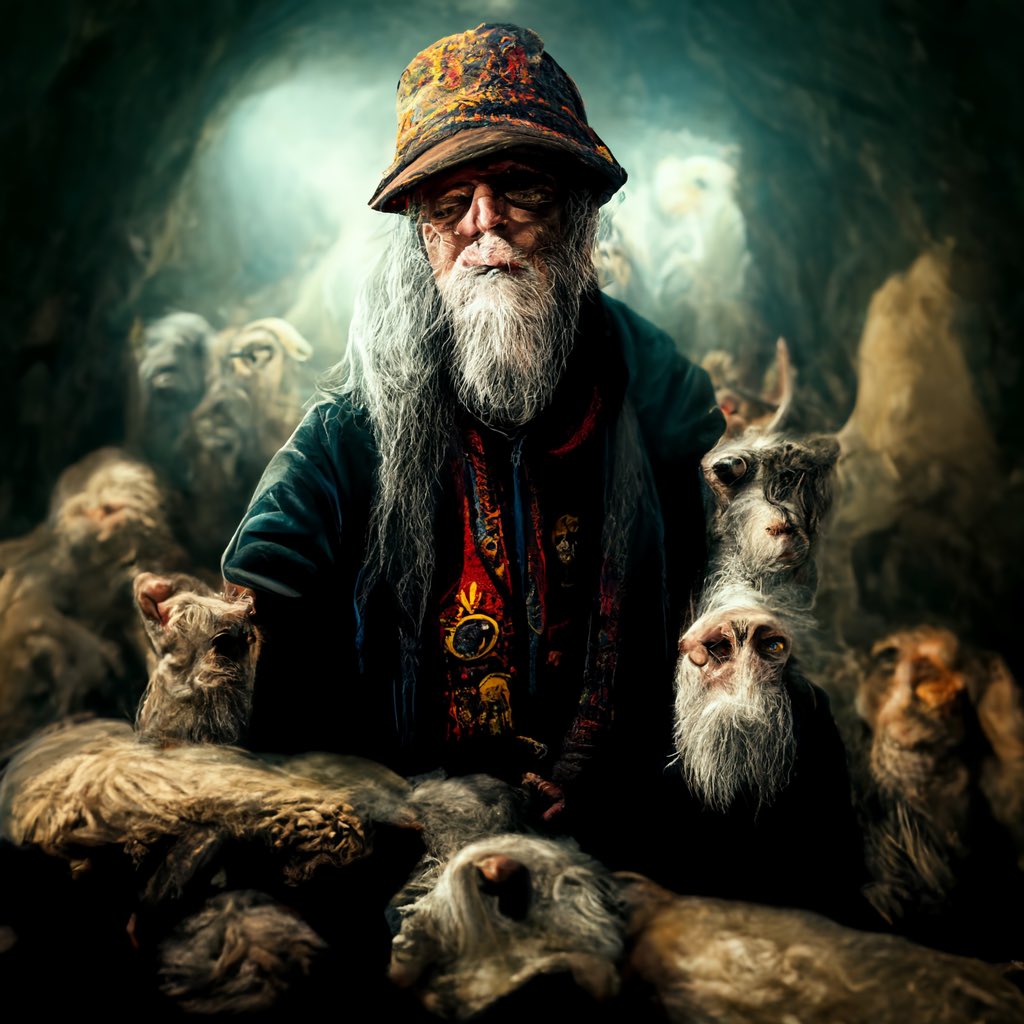 O Vello das Bestas, que habitaba baixo algunhas montañas sagradas, rodeado dos animais do alén.