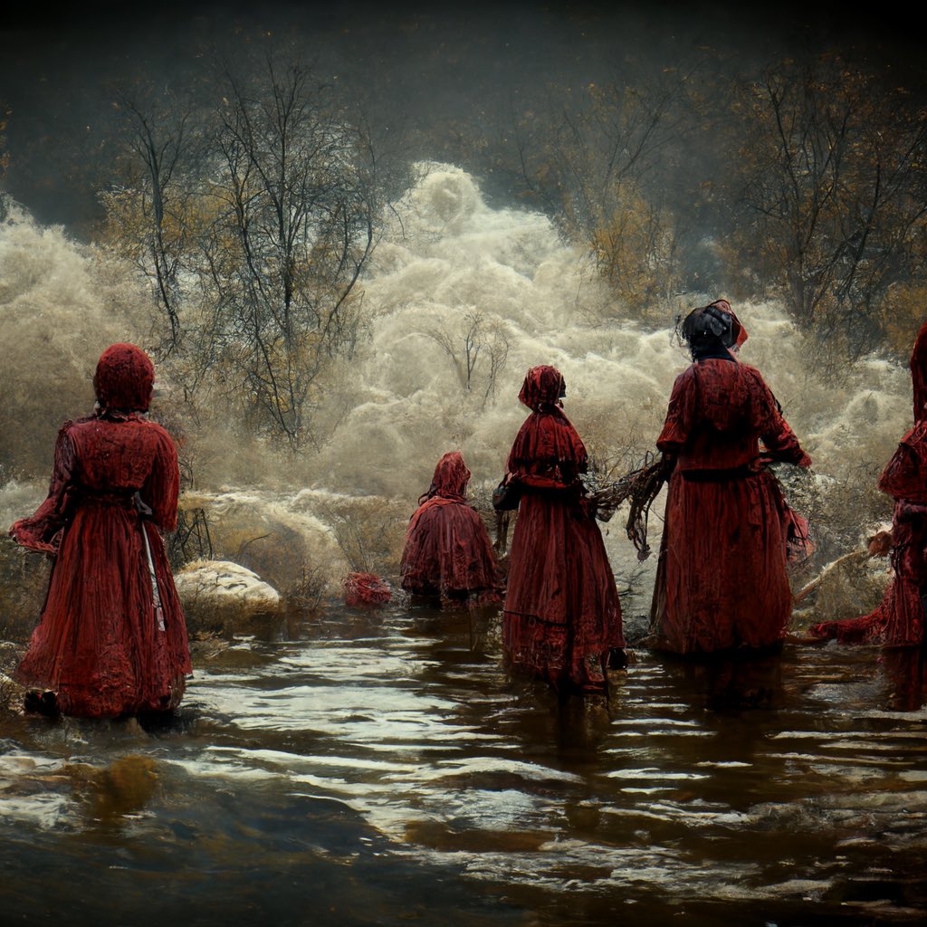 As lavandeiras do río das Pedras en Lesón, na Pobra do Caramiñal, pavorosas mulleres que lavan roupas ensanguentadas, xunguidas polo sangue das palabras coas outras banshees das Fisterras célticas.