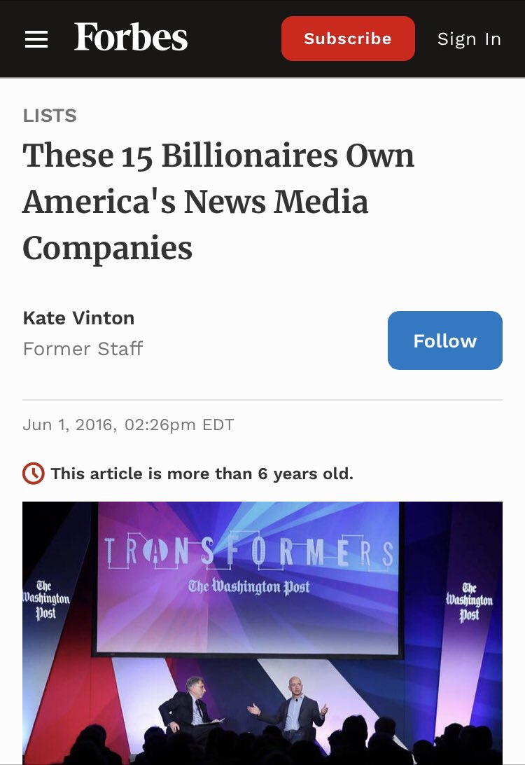 Cette dérive ne touche pas seulement la France. 15 milliardaires possèderaient l’essentiel des médias américains parmi eux on trouve Jeff Bezos, Bloomberg ou Warren Buffett. Bill Gates est également l’heureux bienfaiteur de la presse internationale. forces.com/sites/katevint…