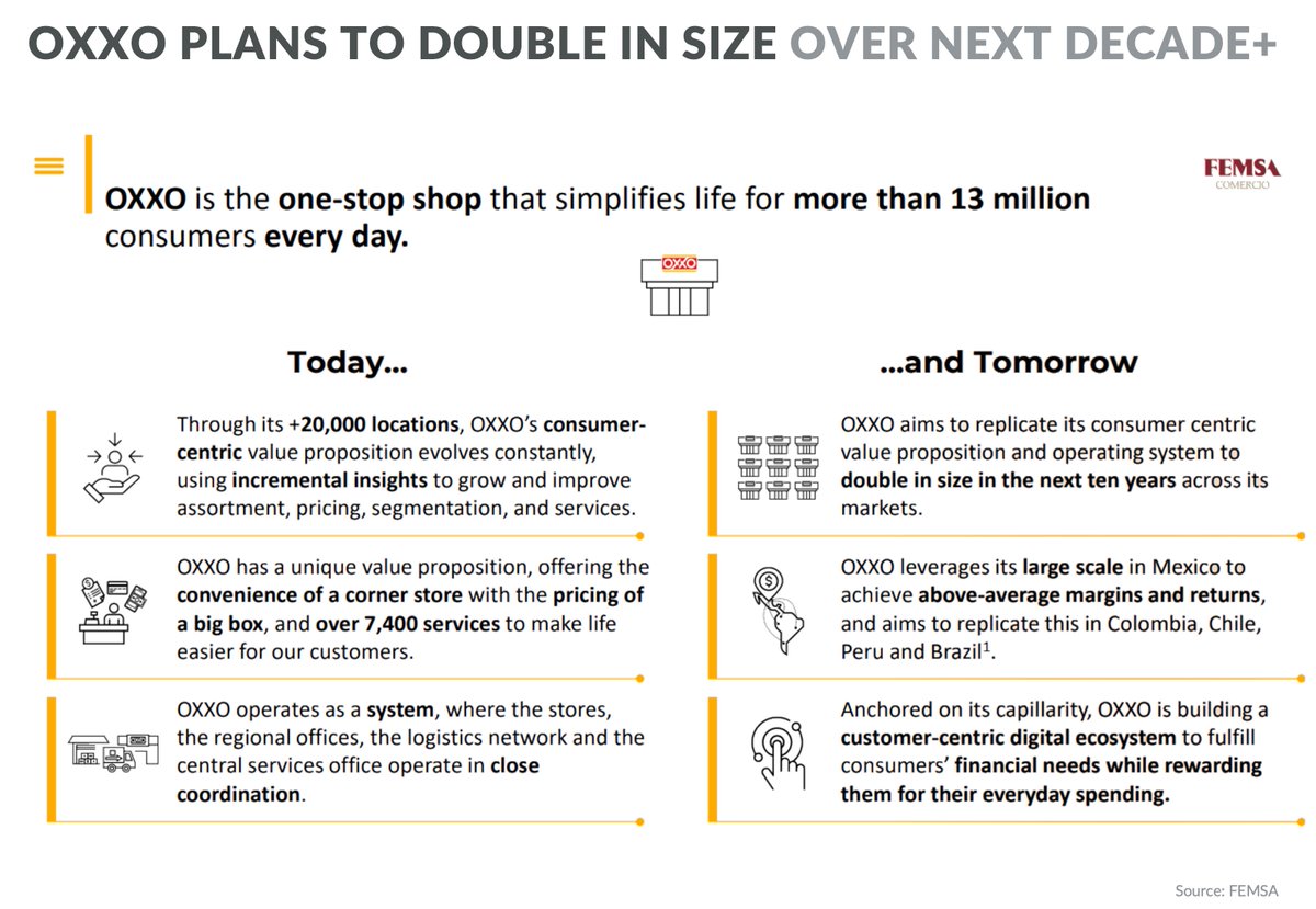Management plans to increase OXXO's store footprint in Mexico 1.5x from 20k to 30k over next 10Y.