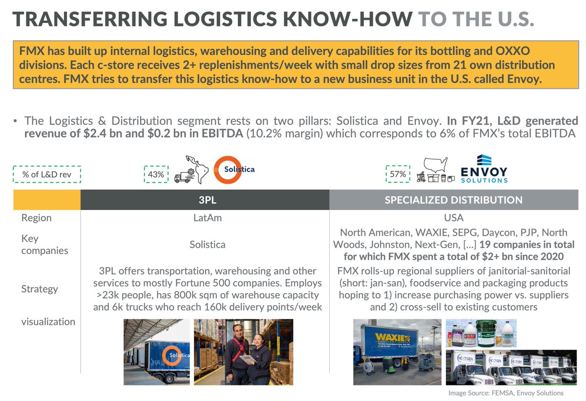 "SEGMENT BREAKDOWNS: LOGISTICS": FMX built up internal logistics capabilities for its bottling and OXXO division and now tries to transfer this know-how to a new business unit in the U.S. called Envoy