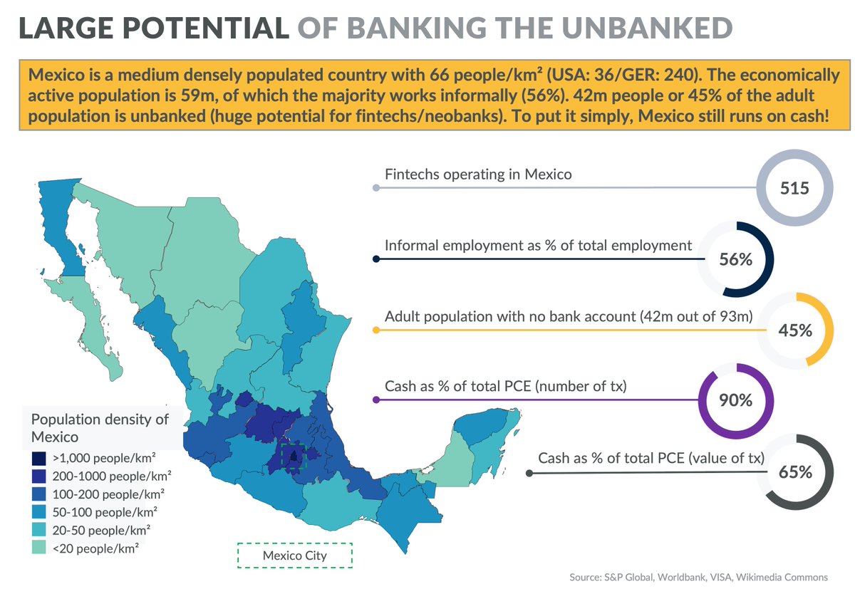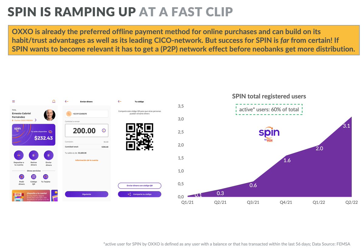 Offline cash-in/cash-out (CICO) agent networks are crucial (see e. g. M-Pesa). OXXO represents 46% of Mexican banking access points, boosting SPIN.