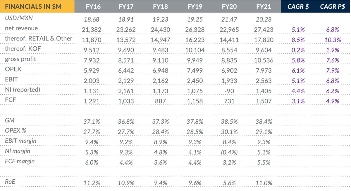 "FINANCIALS AND THOUGHTS ON VALUATION": With $KOF and $HEIA achieving almost no growth, FMX RETAIL with HSD growth drove a consolidated revenue CAGR of 5.1% from FY2016-21.