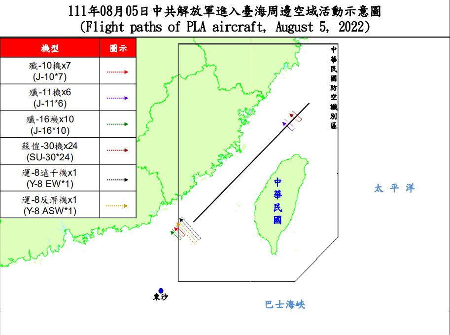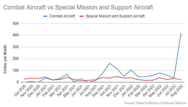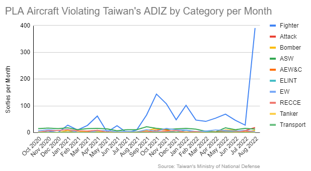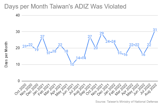 August also had the highest number of days in a month where ADIZ violations were tracked. PLA aircraft violated Taiwan's ADIZ every day this month (31 days). The largest previous was October 2021 (29 days).