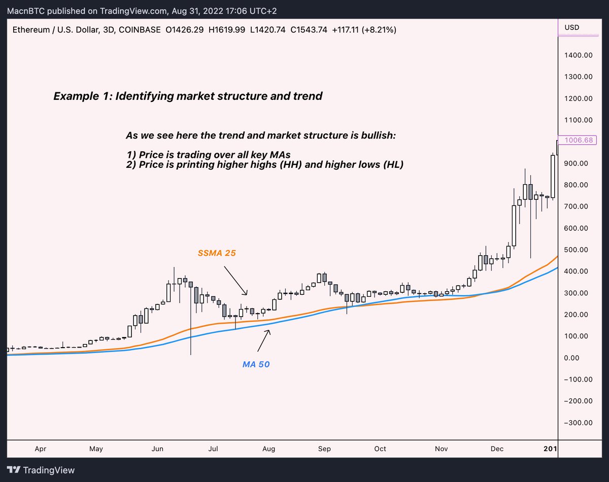 MAs give a general idea of what stage of a cycle an asset is trading in.